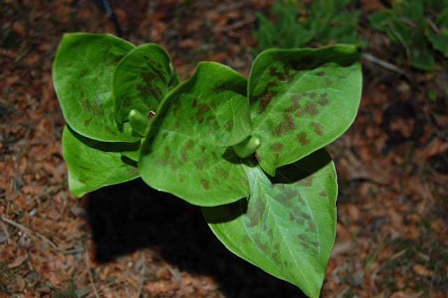 Trillium er en slekt jeg er veldig glad i. Først ut i år er denne som jeg var så heldig å få byttet til meg i fjor - denne heter Trillium nivale og er en liten skjønnhet. Bladene er også lekre med en grågrønn farge. Bildet tatt 2.5.